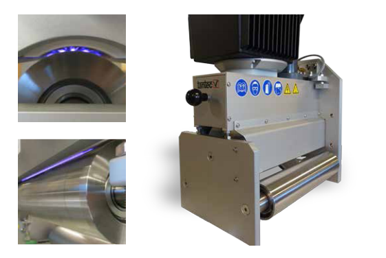 由于聚合物材料的表面能很低,造成了在后道印刷或膠水粘結(jié)出現(xiàn)油墨脫落和粘結(jié)效果不理想的問(wèn)題。為了獲得最佳的粘結(jié)效果,提升材料表面能變成至關(guān)重要的環(huán)節(jié)。通過(guò)Tantec的電暈設(shè)備處理可以顯著提高其材料表面能,改善粘合特性。